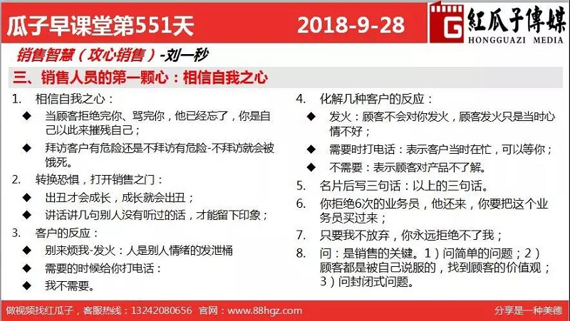 紅瓜子傳媒首頁>相關資訊>最新動態>瓜瓜早課堂第551期-銷售人員的第一顆心:相信自我之心
