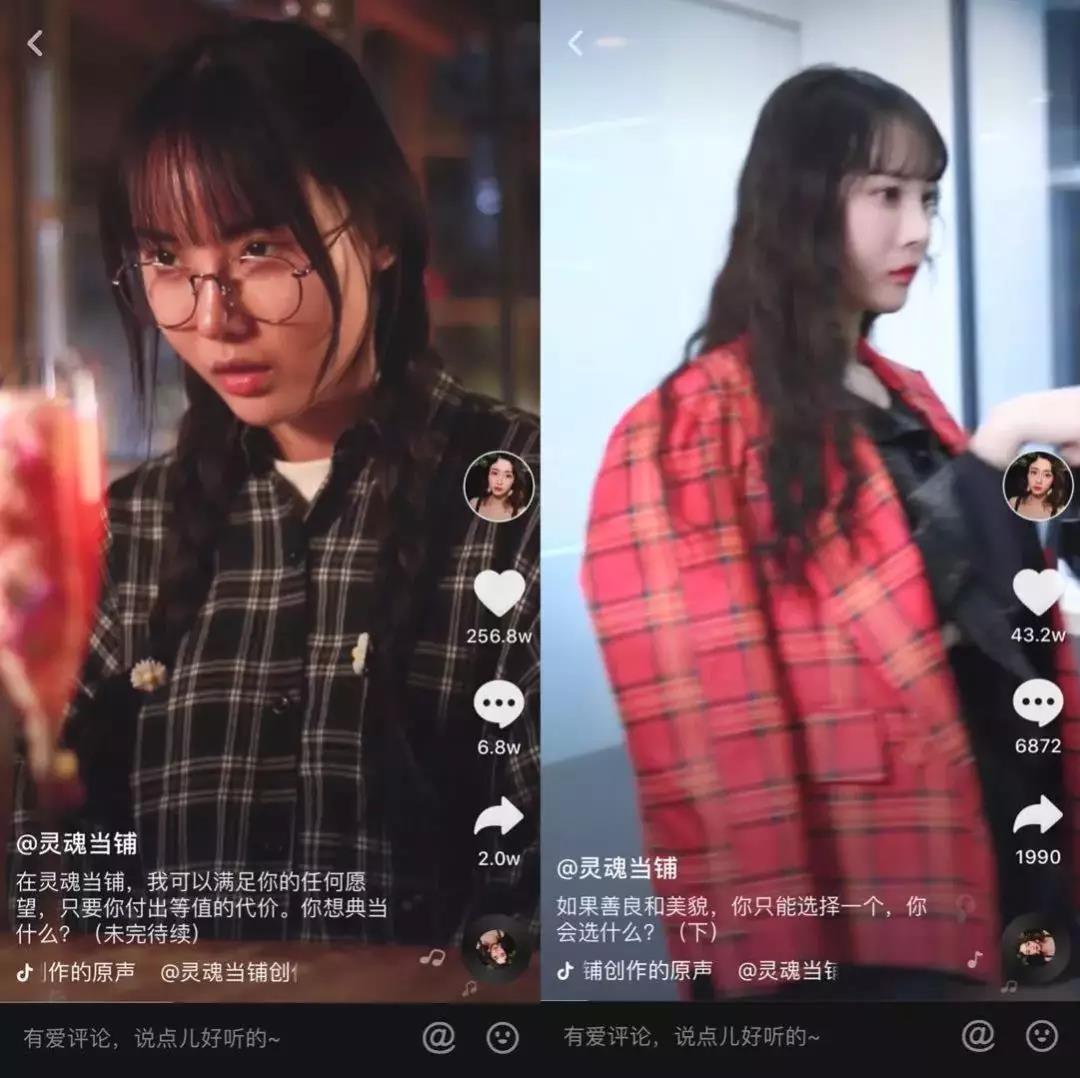 事實(shí)上,抖音上有很多劇情類賬號(hào),但大多數(shù)是一個(gè)視頻一個(gè)搞笑段子。不同的是,「靈魂當(dāng)鋪」一般會(huì)用兩支視頻講述一個(gè)完整故事,以便讓劇情更飽滿,也能吸引好奇結(jié)局的用戶關(guān)注。