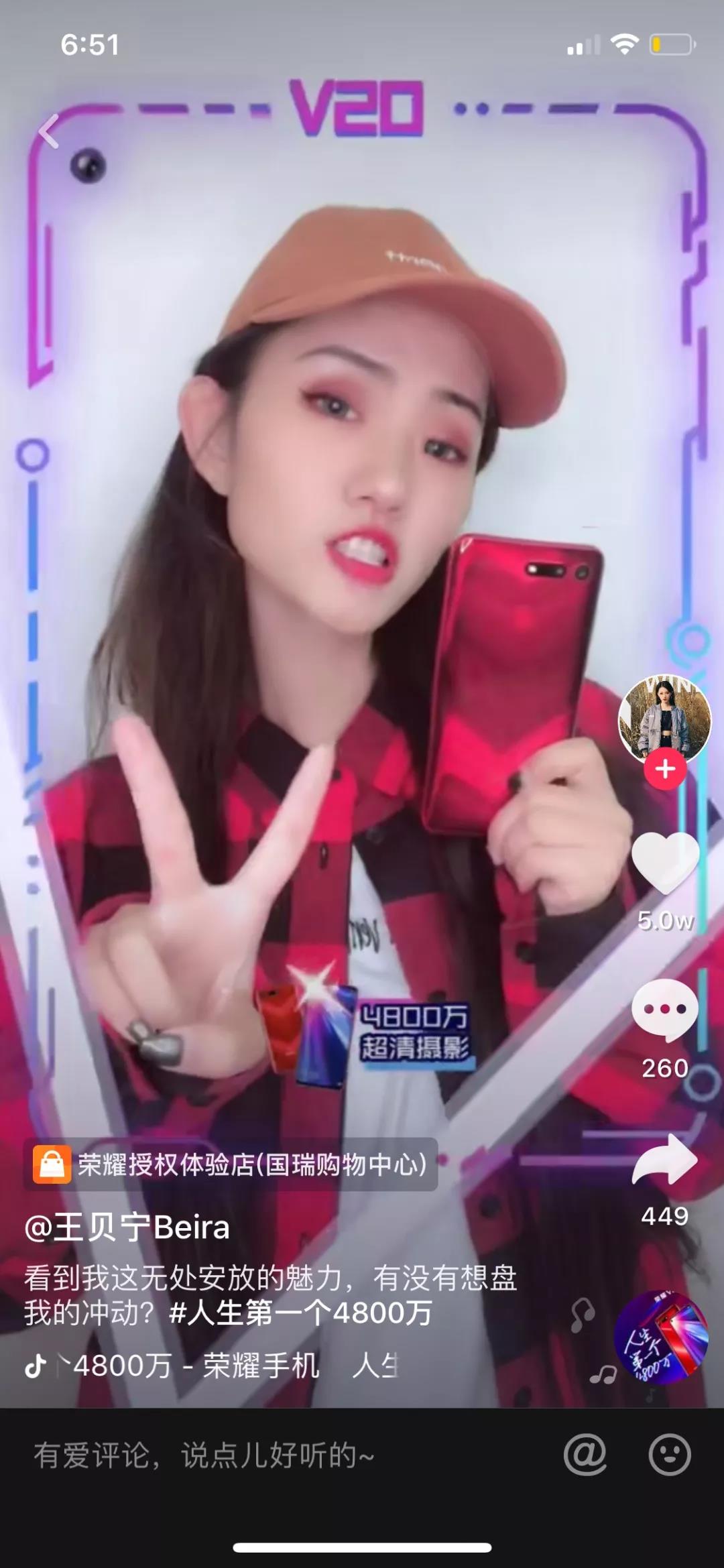 “從一無所有到第一個30萬真的很不容易”,常刷抖音的人對這個旁白一定不陌生。這個熱門BGM就像學貓叫、好嗨哦一樣,只要前奏響起來,每個人的腦海里都會自動接上下一句。由此可見,一款熱門BGM對于視頻傳播的幫助極大。基于對平臺玩法的爛熟于心,榮耀手機此次的挑戰賽,巧妙改編了抖音“第一個30萬”熱門BGM,在2400萬后融入4800萬,并配合視頻反轉為清晰美型的畫面。V20的4800萬超清攝像功能伴隨著入耳的BGM,成為膾炙人口的產品slogan