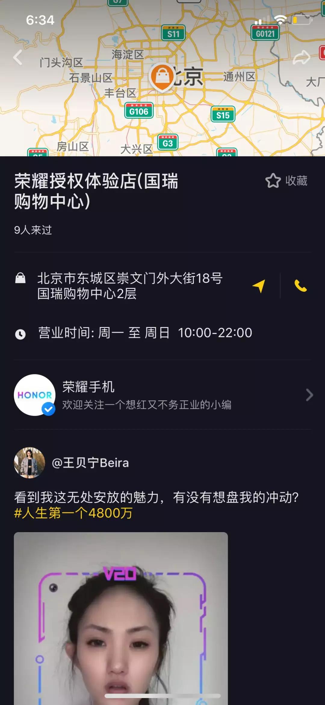 品牌曝光的最終目的是實現產品售賣。過去,品牌營銷往往將線上與線下分開,線上傳播與線下轉化存在天然斷層。抖音作為一個成熟的全鏈路營銷平臺,有著眾多線下轉化組件如POI(Point Of Interest)。本次榮耀手機的挑戰賽項目中,正是利用POI這一強效組件,在榮耀手機#人生中的第一個4800萬 挑戰賽視頻中添加POI信息入口,引導用戶在瀏覽視頻的同時了解POI店鋪相關信息。推動用戶種草店鋪,加速用戶線下消費決策,將線上品牌擴散與線下門店轉化充分結合起來。