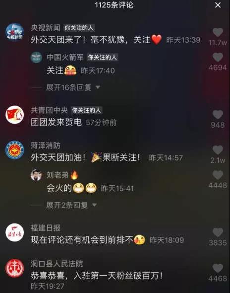 值得注意的是,在“外交部發言人辦公室”賬號入駐抖音的第一天,@央視新聞、共青團中央等各個媒體紛紛前來道賀!