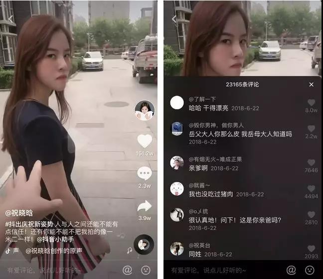 一開始我們也像大多數人剛做抖音的時候一樣,模仿抖音熱門,對個口型,跳個舞蹈,像祝曉晗的第一條視頻內容,就是祝曉晗在我們樓下的商場里,跳的一個舞蹈。