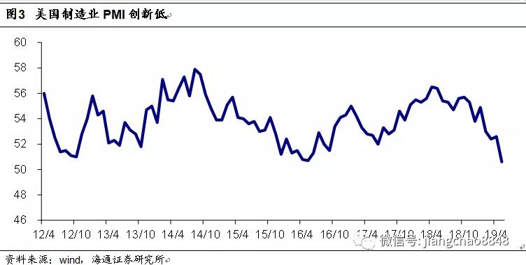 而最大的變化還是在于經濟的下滑。在5月初特朗普重啟貿易摩擦之前,美國公布的1季度GDP增速高達3.1%,而且就業數據也欣欣向榮。但到了6月份,美國Markit制造業PMI指數創下10年新低,新增就業大幅下滑,國債利率曲線倒掛,意味著經濟衰退的風險大幅上升。