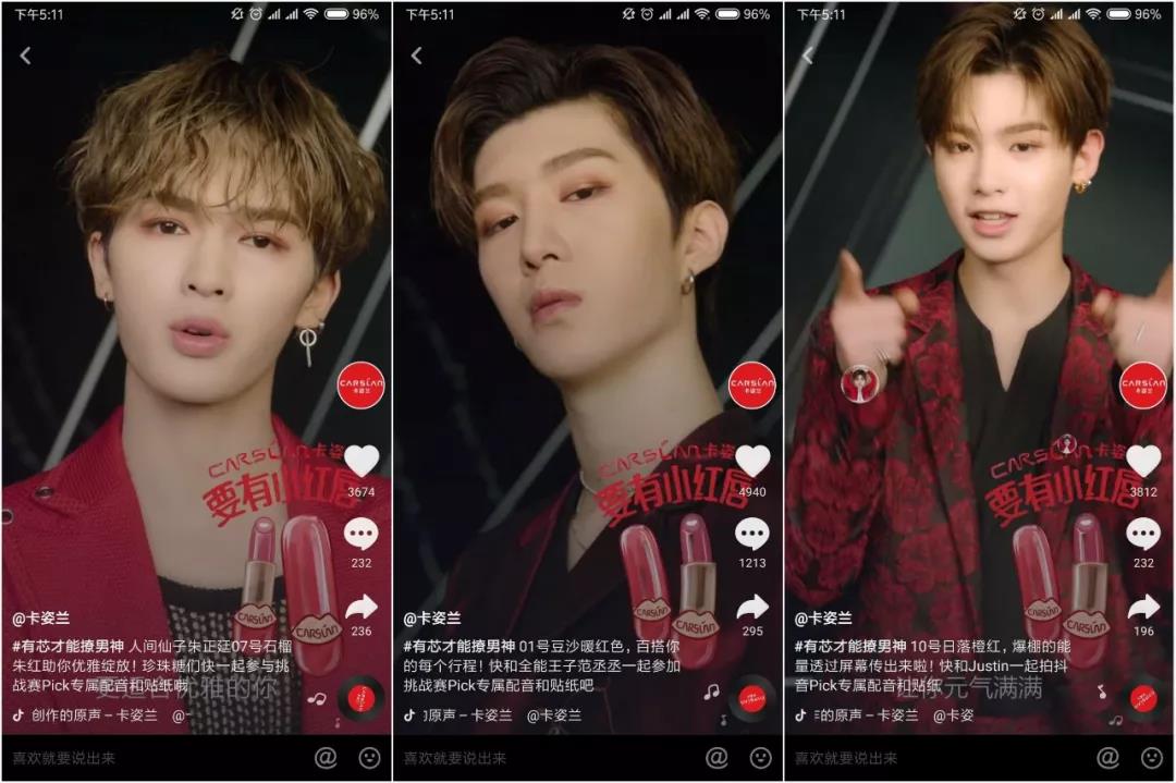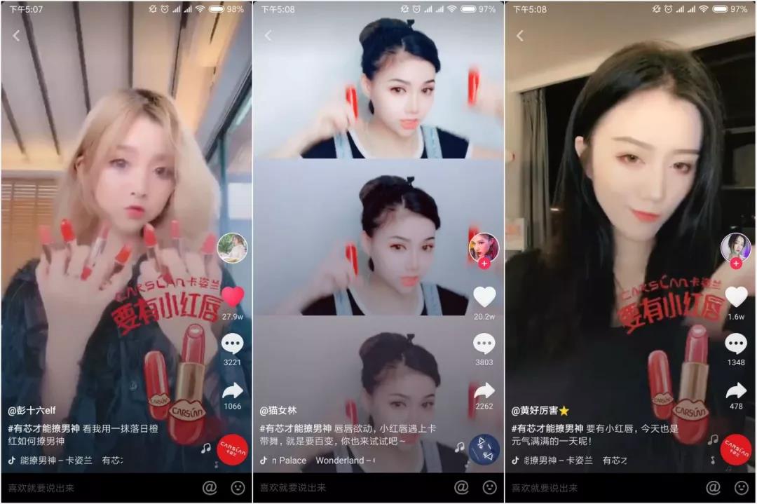 憑此亮眼數(shù)據(jù),卡姿蘭#有芯才能撩男神#挑戰(zhàn)賽強勢占據(jù)美妝行業(yè)商業(yè)化挑戰(zhàn)賽第一名。“小紅唇”唇膏一夜爆紅,成為新一代抖音好物。