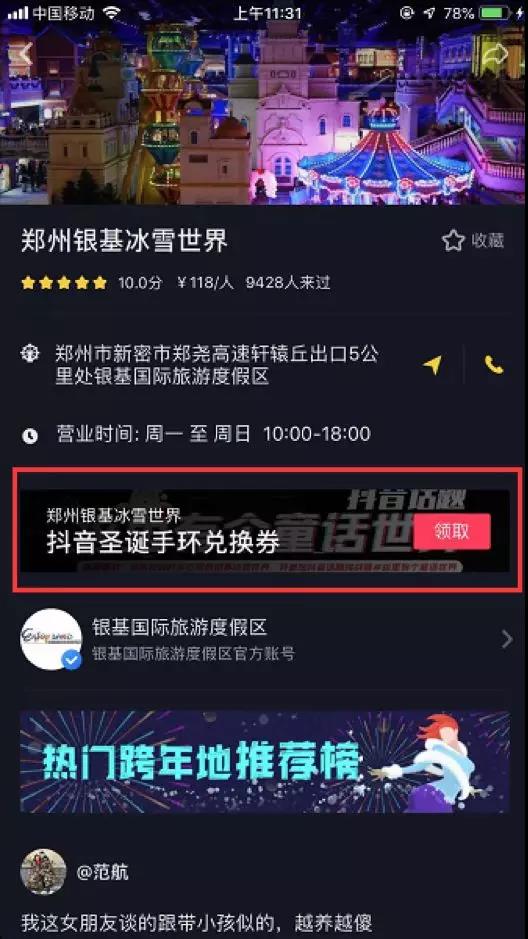 最近,有一處景區的營銷數據進入了我們的視線:單天最高超過3000次點贊的主頁優惠活動頁,集贊、卡券等優惠活動迅速拉高線上用戶到景區的比例,園區內因慕名而來的消費者刺激,人均餐飲和商品消費金額提升了20%.....據以往的經驗來看,不夸張地說,今天所提到的主角——銀基冰雪世界已經在剛過去的圣誕新年季成為了新的打卡地標。